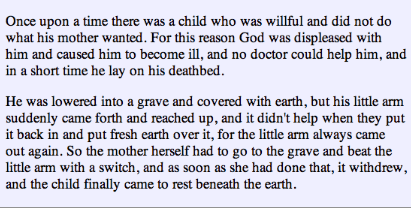 Many years ago, the distinguished German film maker Alexander Kluge brought to our attention a brief tale from the Brothers Grimm titled “The Willful Child” :