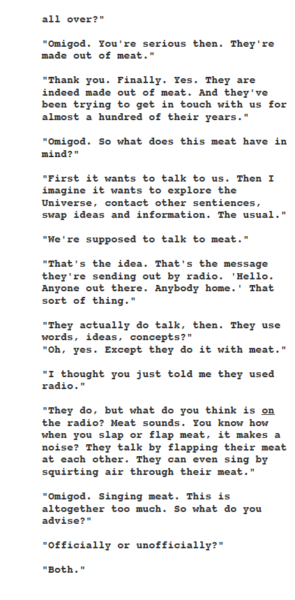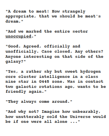 During these dog days of August, we find his brief dialogue between two alien intelligences both entertaining and perceptive, regarding the strange human paradox of sentient meat: