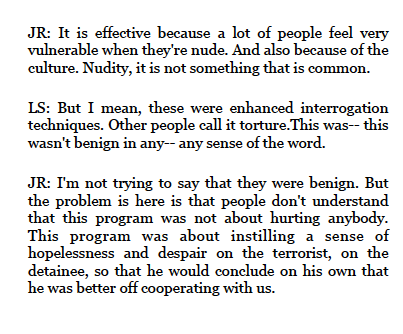 We marvel at the ease with which Mr. Rodriguez articulates the distinction between “not hurting” and in the next breath “instilling a sense of hopelessness and despair”. We also note the instant and effortless elision of terrorist into detainee, as if the designation “terrorist” had been established as legitimate in each and every detention, a claim that we have since learned to be false.