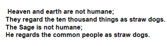 John Gray’s aphoristic compendium of thoughts on humans and other animals derives its title Straw Dogs from an oft-quoted passage in Lao Tzu’s Dao De Jing: