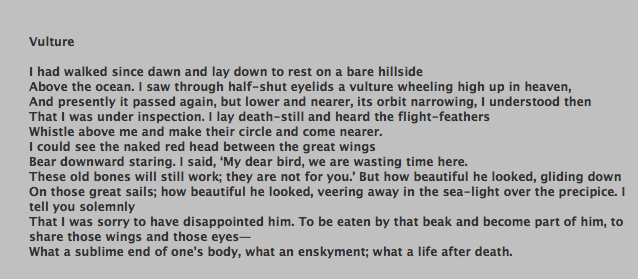 A perspective of “inhumanism” may not be one that we freely choose, but rather one that is forced upon us, as mother earth harshly reminds us of our pathetic insignificance. It may be timely to meditate upon Jeffers’ poem, Vulture: