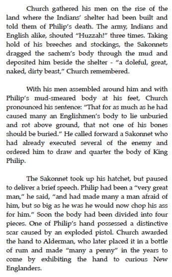 Cornered by a combined force of English soldiers and Sakonnet/Pokasset Indians under the experienced command of Captain Benjamin Church, Metacom was shot through the heart by a Pocasset known by the English name Alderman. Metacom’s wife and son were subsequently sold into slavery in Bermuda.
