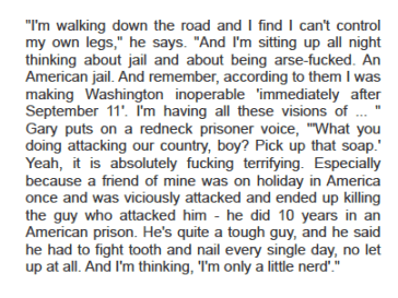 Forgive me, Mr. Rivkin, but apparently you are unaware of the “precise situation” of our criminal justice system. Your comments are laughable. Mr. McKinnon himself displayed a finer understanding of the brutal reality in a rare interview with the Guardian in 2005: