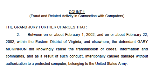 Though we have followed the McKinnon story from the beginning, we had never read the original indictment in its entirety until today. The document presents the UFO researcher as a highly dangerous enemy of the state, one whose eyes (and keystrokes) had penetrated firewalls considered by government prosecutors as critical for the protection of national security.