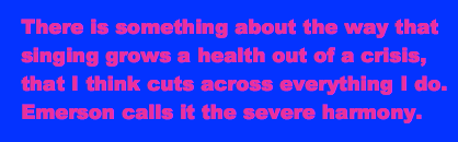 Years later I am working on this corner of my dissertation on the riddle of Ralph Waldo Emerson’s concept of impersonality, which has to do with this same knot where private digging is the scene of an experience of drastic commonality. This scene is both relieving and obliterating. There is something about the way that singing grows a health out of a crisis, that I think cuts across everything I do. Emerson calls it the severe harmony.