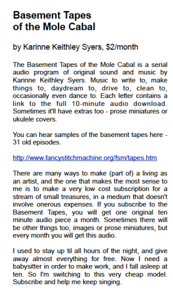 The subscriber serial (I know it’s called podcasting but… ) has a weird kind of tenderness. You make it on headphones, you imagine it being listened to on headphones; it’s very intimate. Yet at the same time it’s a message in a bottle and you can expect that message both to travel and to survive in a way that live performance can’t. Emotionally I wanted a place to keep working, and at that time it had to be underground. My first episode was called “Music you can dance to,” which one of my first subscribers thought was a joke. It wasn’t actually; it was taken from the music I had made for the end of my show ASTRS (about a rabbit revolution in eternal return), built by plundering a Faust track.