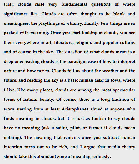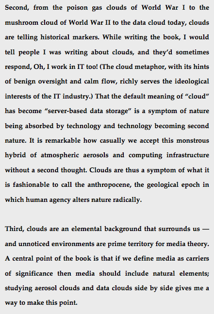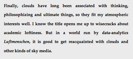 Now comes John Durham Peters, floating a few thoughts in the vicinity of his book The Marvelous Clouds, in which he outlines a philosophy of elemental media that is anything but vague. The images are from the haunting cloud generations of artist Berndnaut Smilde.