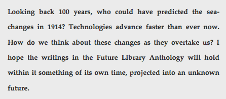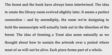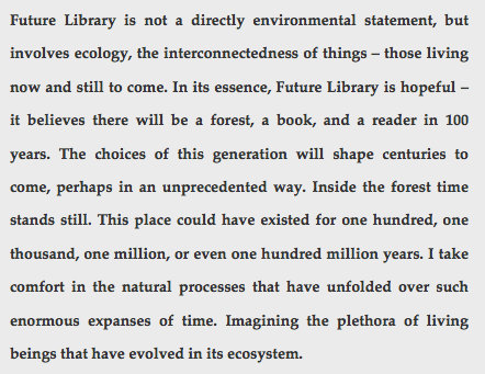 Now comes artist Katie Paterson, who has planted a small forest in Norway. In 2114, that forest will supply paper for a special anthology of books. Between now and then, one writer per year will contribute a text; the accumulating anthology will be held in trust, unread and unpublished, until the year the forest transforms into manuscripts that will be presented in a specially designed room in the Oslo public library.