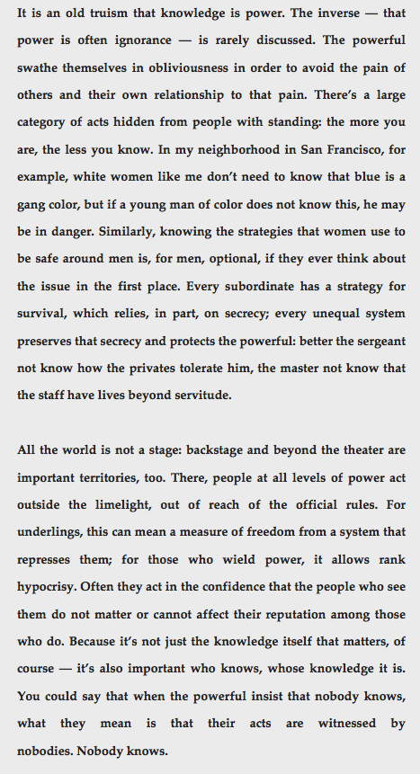 Though Solnit focuses mostly on sexual abuse of women by more powerful men, we would suggest that the identical dynamic applies to a more distant form of violence. Jill Stauffer, author of Ethical Loneliness: The Injustice of Being Heard, directed us to a remarkable analysis of drone warfare in an essay titled Phenomenology of a Drone Strike, in which Nasser Hussain traces how the military power to obliterate “unseen” civilian bodies becomes inscribed within the perceptual parameters of the weapon itself: