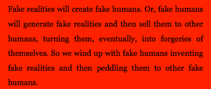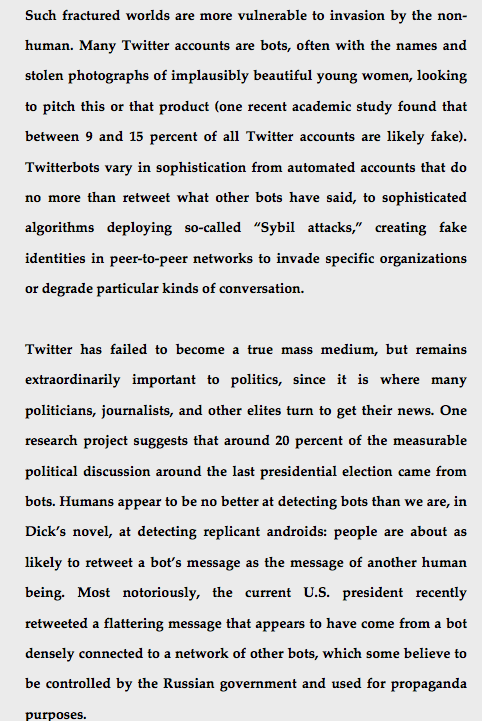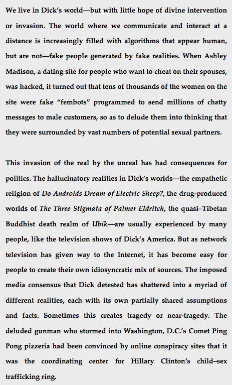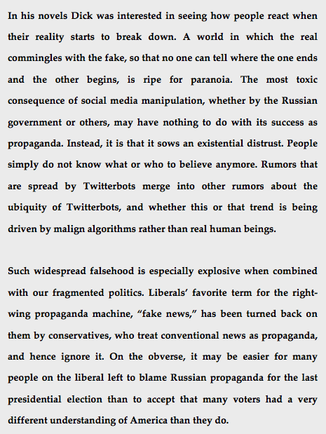 Now comes Henry Farrell, in excerpts from an essay exploring key themes wired from the brain of Philip K. Dick, an essay that is included in the Global Dystopias issue of Boston Review. Our title descends from an essay by PKD himself, in a passage cited by Farrell: