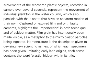 “The aim of my work is to engage with and stimulate an emotional response in the viewer by combining a contradiction between initial aesthetic attraction along with the subsequent message of awareness. The research process is a vital part of my development as the images I make are based on scientific fact which is essential to the integrity of my work. The impact of oceanic waste is an area I am committed to pursuing through visual interpretation and in collaboration with science, hoping it will ultimately lead to positive action in tackling this increasing environmental problem which of current global concern”