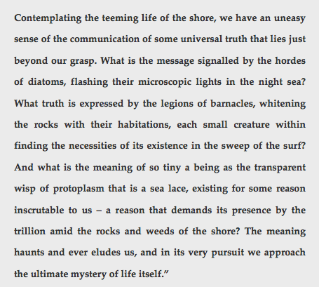 Next, we retrieve a favorite passage from Rachel Carson’s magnificent Edge of the Sea, a vivid reminder of what we have — already! — lost: