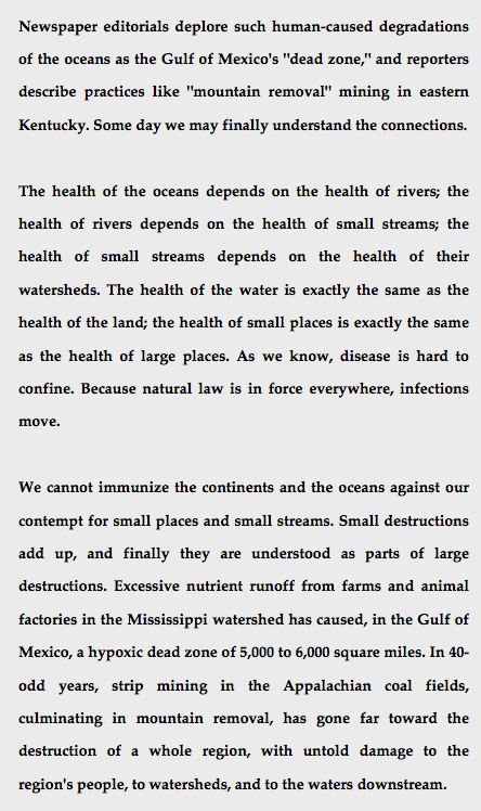 First, let us listen to the voice of Wendell Berry, in a 2003 essay that still rings true today: