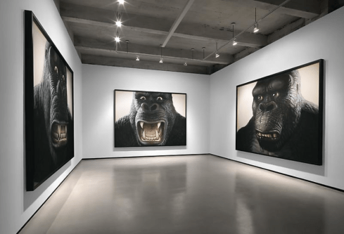 The first series, presenting three huge portraits of King Kong, is based on the 1933 movie co-directed by Merian C. Cooper and Ernest B. Schoedsack. As Ford explains, “The depression era Kong was misshapen, not modeled on any living ape. He has an odd, ugly, shifting charisma like Cagney, Edward G. Robinson, or Bogart. Naturally, his woman screamed in terror. She continued screaming throughout their time together. The grief of the original Kong is the grief of the unloved, and like Humbert Humbert or Frankenstein, the grief of the unlovable. In 1933, Fay Wray says words that would break any suitor’s heart. She shrinks from the chained Kong and tells her human lover, ‘I don’t like to look at him…’ Since Kong is a Hollywood tough guy, he covers up his heartbreak with violence and anger. These paintings are about Kong’s heartbreak. I wanted to reveal the monster’s grief, his enormous sadness, the sorrow that the original Kong kept hidden from view.”