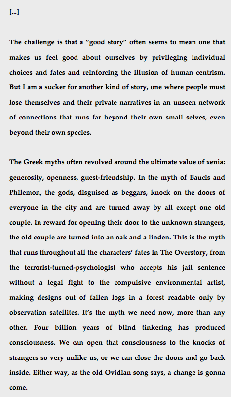 Now comes Richard Powers, on the role of literature (and the moral responsibility of fiction writers) in the time of the Sixth Extinction: