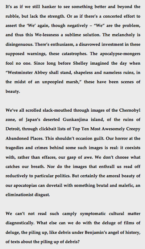 During a strange New England summer of extreme heat waves, monsoon rains and an unnerving paucity of flying insects and pollinators, it is difficult to avoid slipping into the dark selfie-swamp of radical dystopia, the one where we (homo sapiens) disappear from the universe; thus we turn to an illuminating excerpt from an essay by China Miéville, exploring the interplay between apocalypse and utopia.