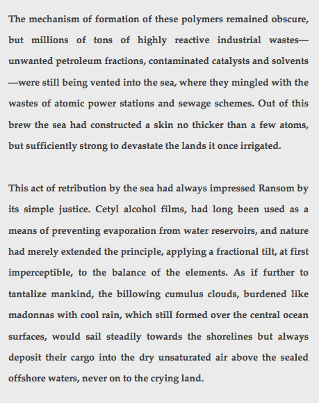 Now comes JG Ballard with a passage from a novel that was initially published in 1964 as The Burning World, then revised and expanded the following year into The Drought. We suspect that if Ballard were around this summer, he might consider reverting back to the first title.
