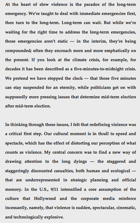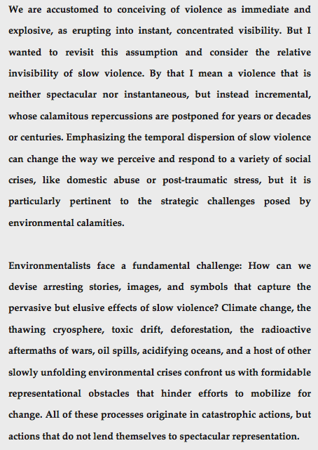 […] climate emergency deepens, whether expressed through the slow violence of drought and famine or through more dramatic phenomena such as bomb cyclones and wildfires, […]