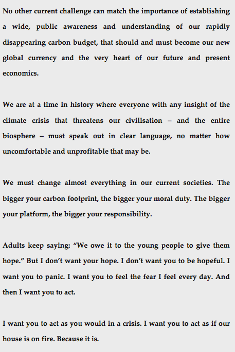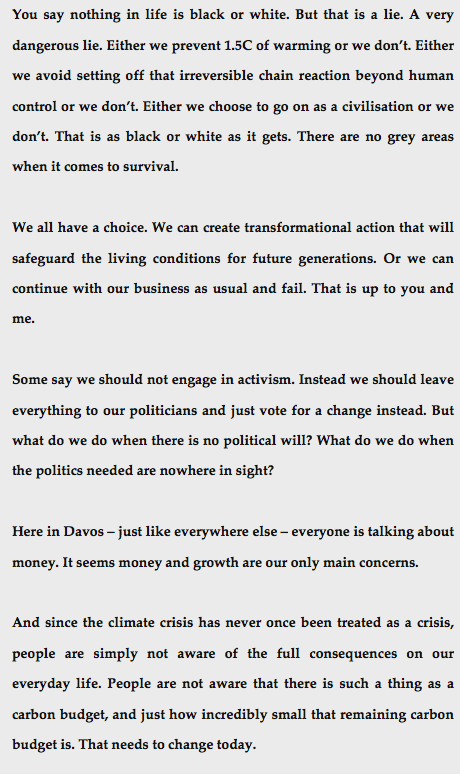 As at COP24, that shamefully inert gathering inside a former Polish coal mine towards the end of last year, the only person who made any sense whatsoever during the annual Davos Festival of the Exalted Egos: Greta Thunberg, as she broke the stupefying complacency with a concise call for urgent action towards the creation of a radically new political and economic paradigm.
