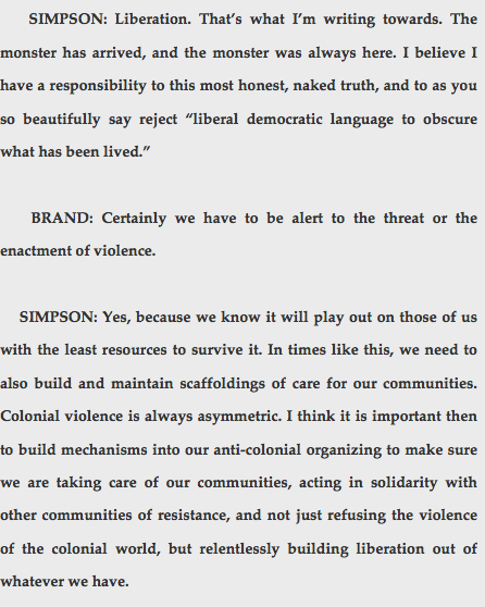 This week, we relay a passage from a remarkable conversation between two of the most indispensable writers in North America: Leanne Betasamosake Simpson and Dionne Brand.