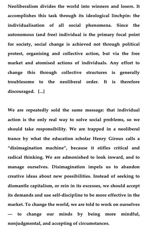 Now comes Ronald Purser, author of the recently published McMindfulness: How Mindfulness became the New Capitalist Spirituality. His recent “long read” essay in the Guardian summarizes the central thesis. The entire essay is worthy of serious consideration; we find the below excerpts particularly compelling, including a lucid description of neoliberalism’s most pernicious ideological mantra. Images are relayed from the studio of Greg Dunn.