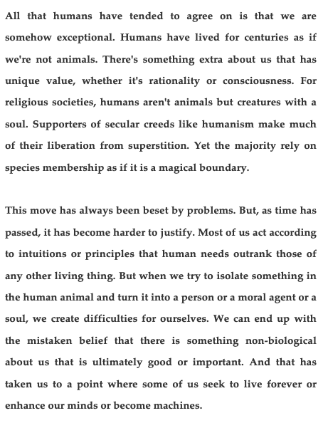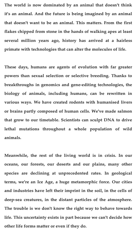 Now comes the well-named environmental philosopher Melanie Challenger with an important new exploration of how human supremacism came to be the entrenched self-identity for “civilized” mammals within the less well-named species, Homo Sapiens.