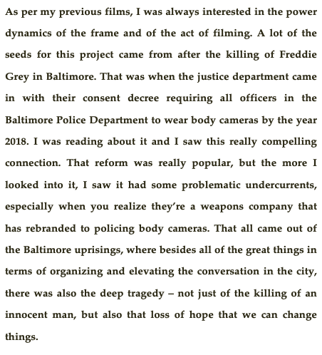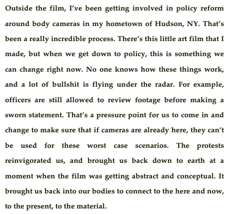 Now comes documentary filmmaker Theo Antony via an interview regarding his most recent film, wherein he explores the micropolitics of police body cameras among other power dynamics within the dominant surveillance ethos, as well as the inherently slippery nature of all documentary evidence.