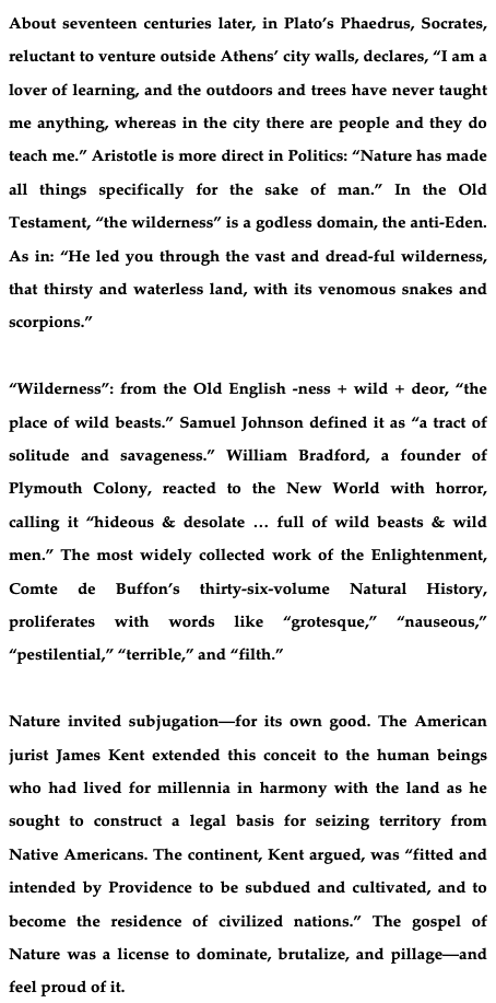 The exceptional (thereby unheeded) chronicler of climate emergency Dahr Jamail, by way of a positive NYT review, brought Nathaniel Rich’s recently published Second Nature to our attention.