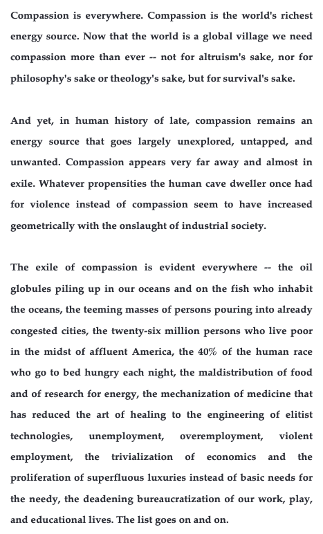 We are grateful to DP friend and correspondent Janet Coster for steering us towards a passage from A Spirituality Named Compassion, by Mathew Fox. First published in 1979, every word still rings true during a time when compassion seems not only exiled, but extinguished.