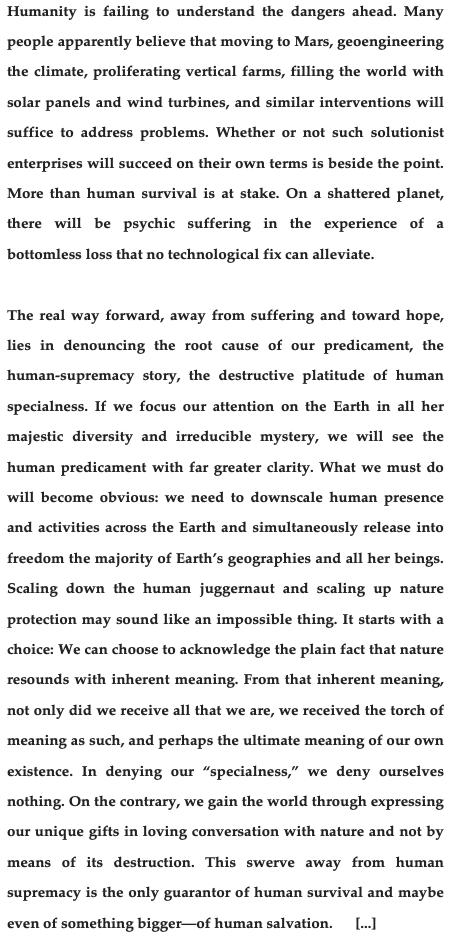Now comes author, deep ecologist and philosopher Eileen Crist with excerpts from a recent blog post, affiliated with her excellent journal, The Ecological Citizen.
