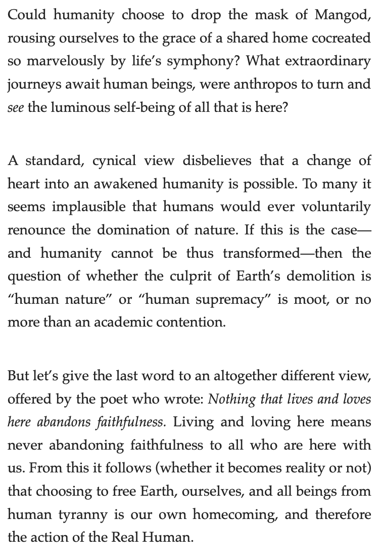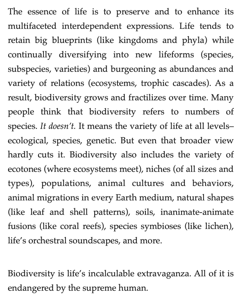 Now comes Eileen Crist, whose writings we consider of paramount importance during these times of environmental polycrisis, with “life’s incalculable extravaganza” crushed beneath the iron boot of human supremacism. Excerpts from a recent post on Earth Tongues: