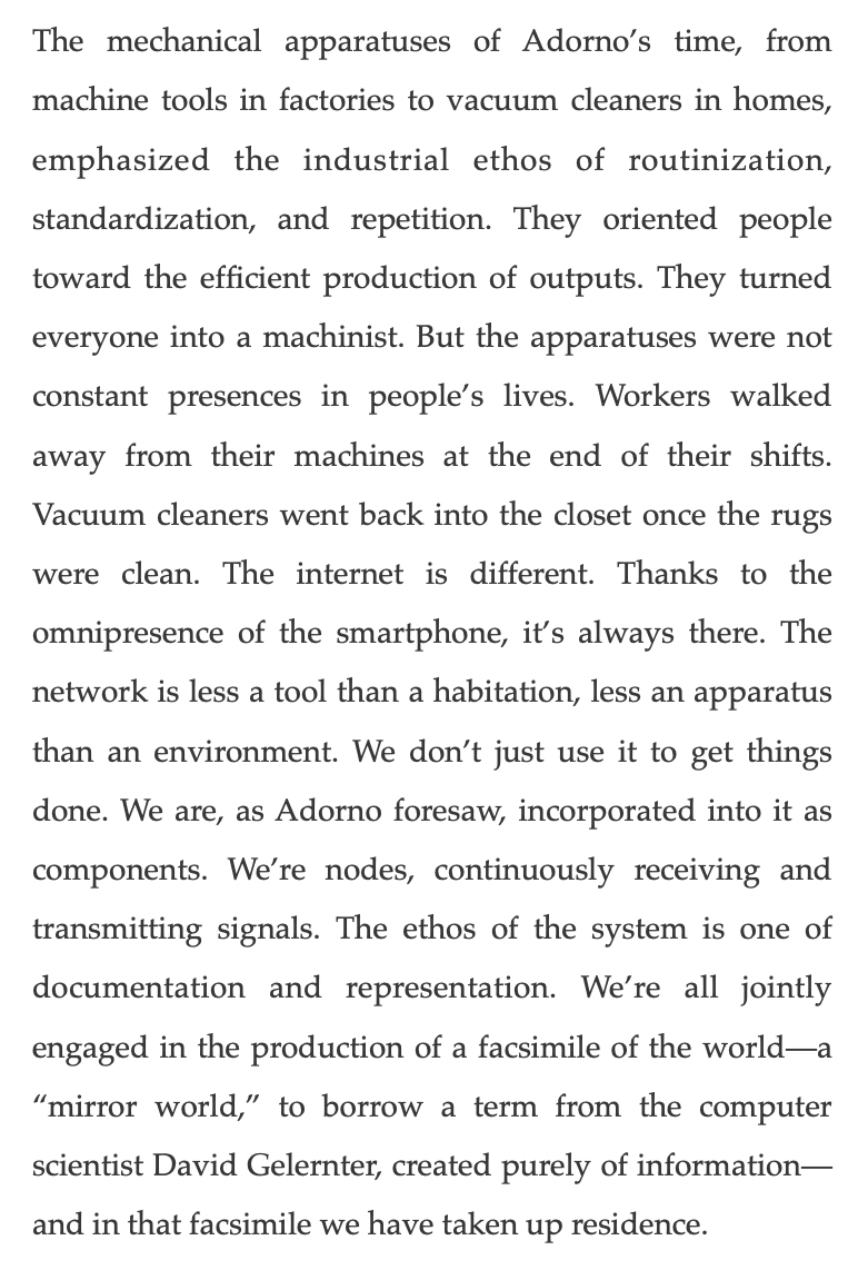 Now comes Nicholas Carr, eminent cartographer of the data mine in all its hallucinatory caverns. An excerpt from a recent post on his endlessly illuminating substack: