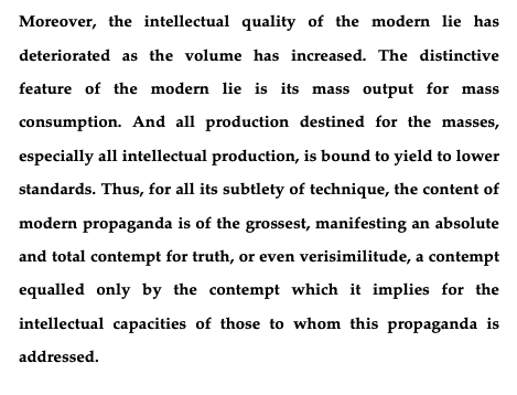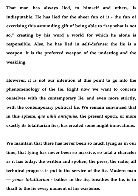 Now comes Hegel scholar and political philosopher Alexander Kojève, writing in 1943. We dare say the “records” to which he alludes in the second paragraph have surely been not just broken but shattered during the relentlessly mendacious Trump years, most notably (and dangerously) in the abundance of bunkum saturating the vast & delusional MAGA zone in the aftermath of recent elections.