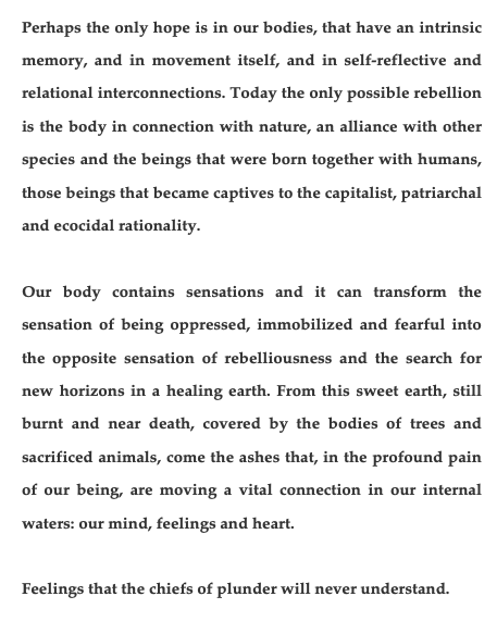 While political events continue to serve as massive noise generators that obscure the deeper stories unfolding around us, stories that may eventually enfold and envelop us — among them, the slash & burning of the Amazon rainforest — we listen to a pure cry of visceral pain transcribed into the body of an essay by writer and climate activist Elisabeth Peredo Beltrán.