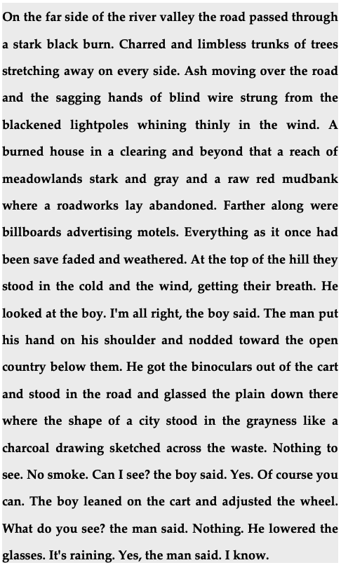 As wildfires continue their hungry devastation across California and Oregon, we have been re-reading Cormac McCarthy’s The Road, a spare yet powerful novel that we have always thought of as an anticipatory documentary narrative, describing a near future now in the process of presenting itself.