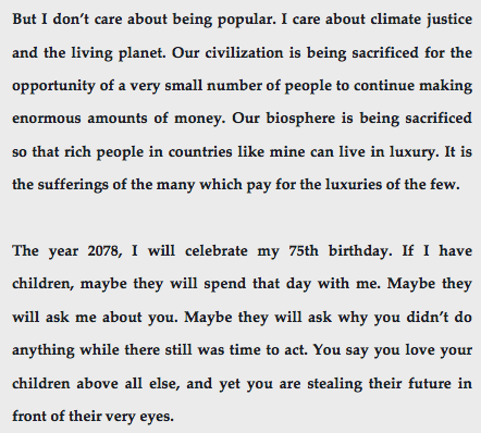 Amidst the disgraceful blather pumping through the sound system inside the former coal mine that served, perversely enough, as the assembly hall for COP 24, there have been a few sane voices. First, we relay the address of activist Greta Thunberg in its entirety; lucid, not a single word wasted, and cutting to the very heart of the matter.