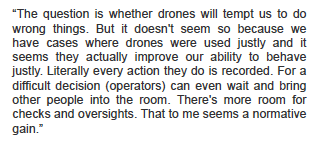 He also asserts that drone warfare permits greater transparency and accountability, since each deployment is recorded for later analysis: