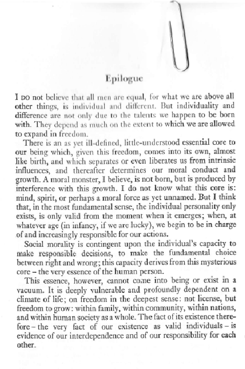 In closing, we submit the epilogue from our DP office copy of Into That Darkness, in which she neatly summarizes her perspective on the social conditions for an active moral consciousness. Her fearless grappling with the mysterious core of human identity remains more relevant than ever, as the species spins off into yet another crazed Tarantella of corruption, cruelty and slaughter. The incomparable Gitta Sereny: the world will be very fortunate indeed to see her kind again.