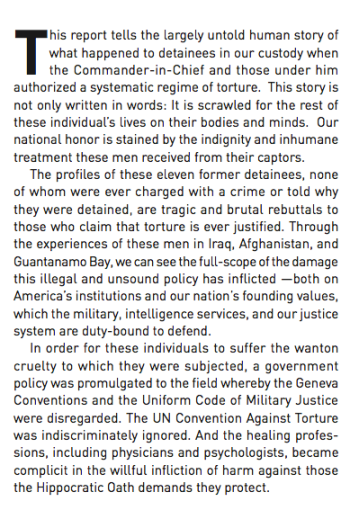 By stark contrast, let us recall lucid preface contributed by Major General Antonio Taguba to an extensively documented analysis of medical evidence released by Physicians for Human Rights in June 2008:
