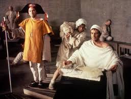 The setting is the asylum of Charenton, and the script indicates a “many stranded whip”. Brook has decided to take this idea and make it part of the actor’s body. Patrick McGee receives the whipping; Brook observes the rhythms of Jackson’s lashings carefully, as that rhythm will provide a sort of narcoleptic metronome for one of the most important speeches in the play. Jackson will play the asylum patient who in turn plays CORDAY, with McGee playing SADE, who serves as both director and victim within the scene. In the 1967 film version, here is how the experiment played out: