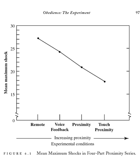 The results are summarized in a graph recording mean maximum shocks throughout the proximity series, data that indicates a significantly reduced willingness to inflict pain as the physical relationship between subject and victim becomes more close.