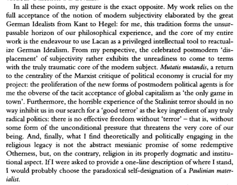 True, we have never really understood the Zizek phenomenon, though from time to time we venture into his copious textuality in search of clues for what it is all about. Here is one little nugget dug from his own preface to The Zizek Reader: