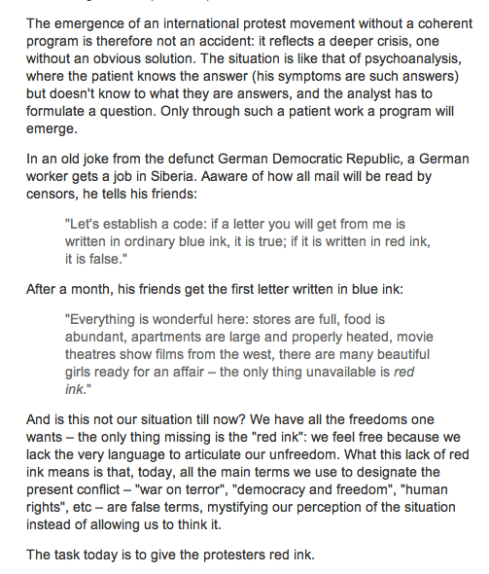 This peculiar and self-indulgent pronouncement left us so befuddled that we convened an emergency staff meeting to meditate, mutatis mutandis, upon the fate of Paulinian materialists, wherever they may be. Yet this is the very same fellow who cautions the mostly anonymous participants in the purposefully leaderless Occupy movement not to fall in love with themselves? Sigh. (And could someone please email us an explication of Zizekian “good terror”?)