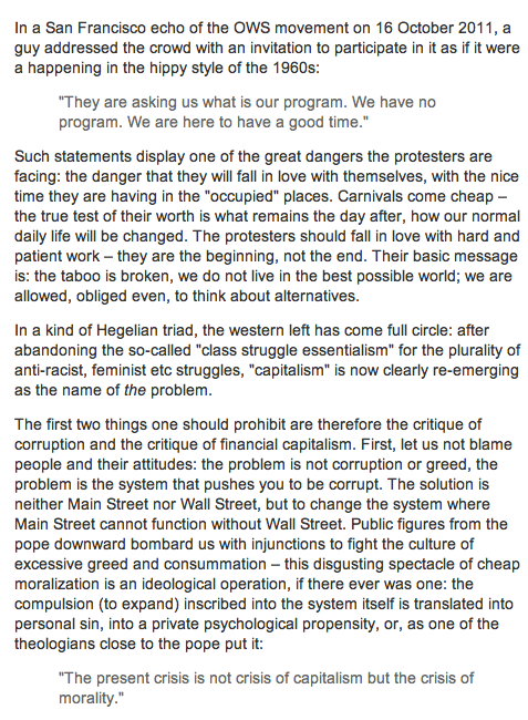 Is Zizek then also saying that the Occupy movement lacks seriousness because certain participants may be present on the scene for reasons of pleasure, connection and community? What if the experiences he wrongly dismisses as “the carnival” are absolutely central to “how our daily life will be changed”? Has Elvis left the building? Or is he just having us on? We know that Zizek loves a good joke, and indeed he closes his remarks with the following:
