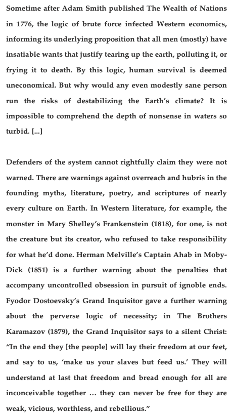 Now comes Oberlin professor emeritus David Orr, with timely excerpts from his contribution to a recently published book edited by Vandana Shiva, reminding us that human brutality is not limited to that violence we inflict upon each other. Thus, from the Annals of Hubris and Delusion: