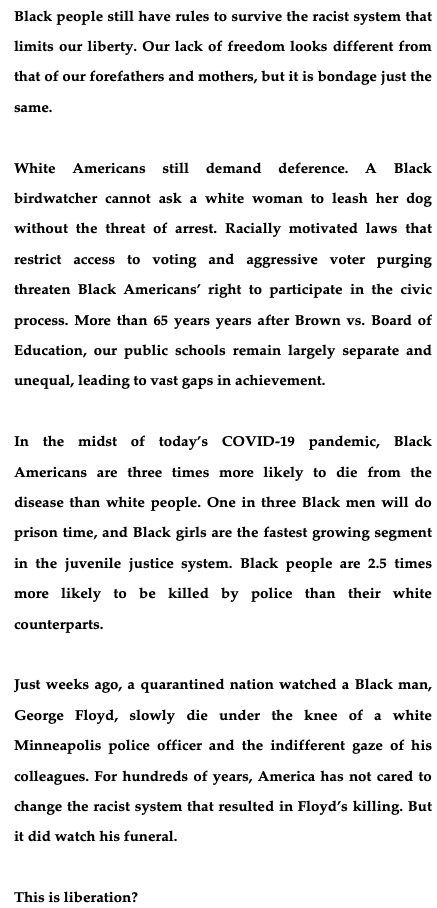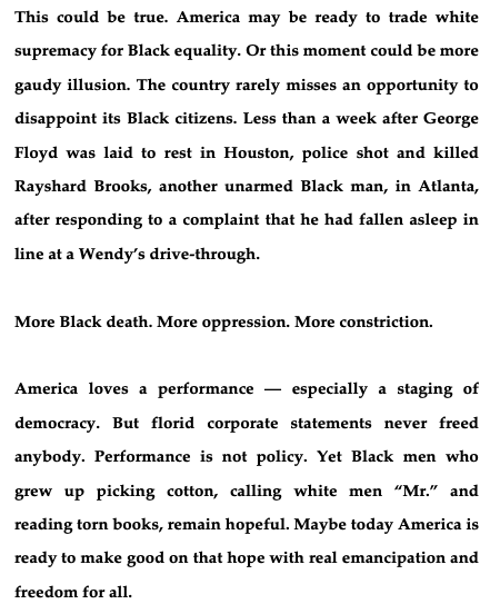 “Words of Emancipation didn’t arrive until the middle of June so they called it Juneteenth. So that was it, the night of Juneteenth celebration, his mind went on. The celebration of a gaudy illusion.”